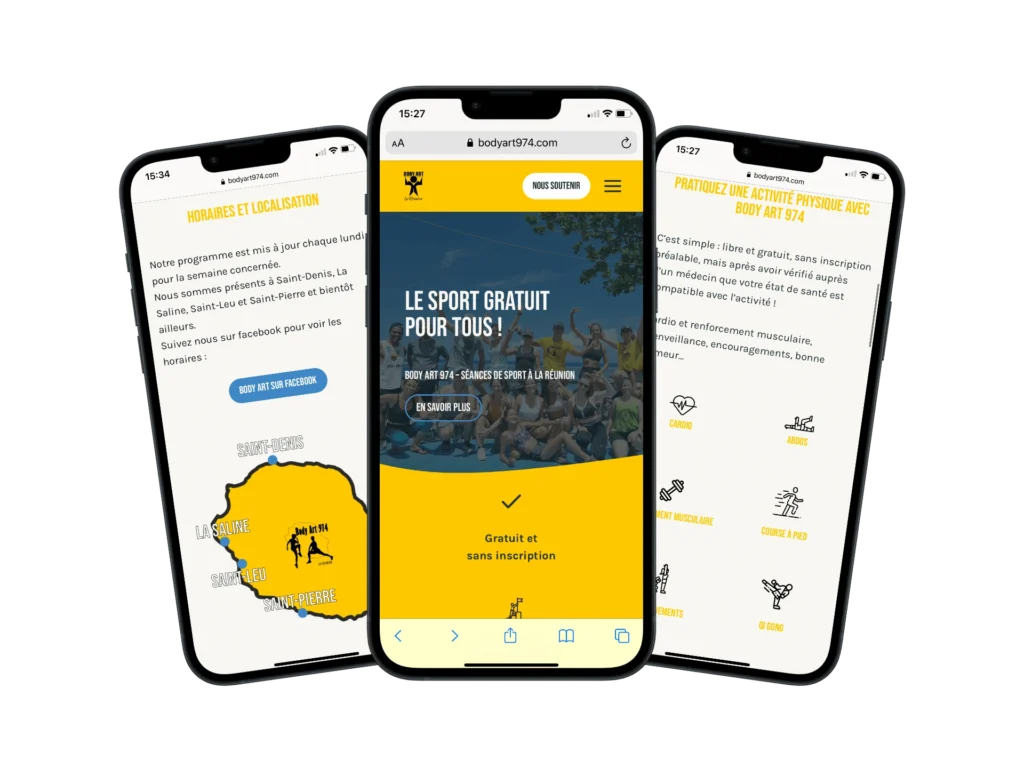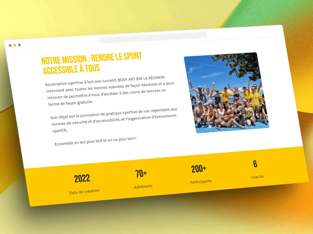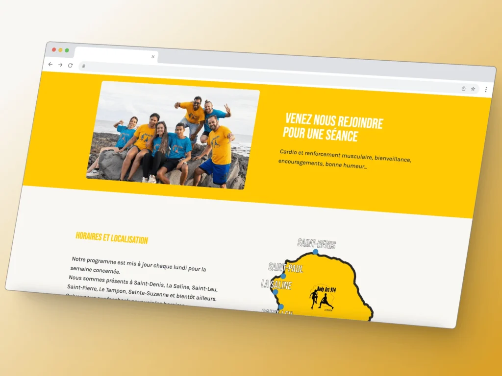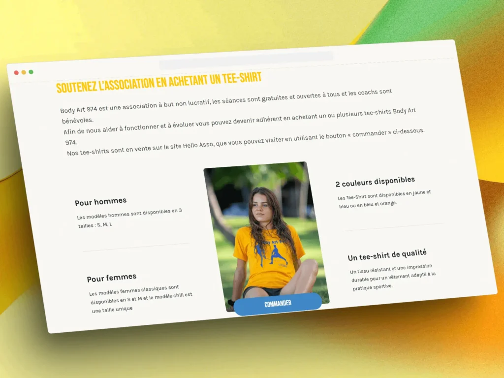 Refonte du site internet pour présenter l’association sportive BodyArt 974, les activités pratiquées, les coaches, les horaires et lieux des séances et mise en place d’une page de vente pour soutenir l’association.