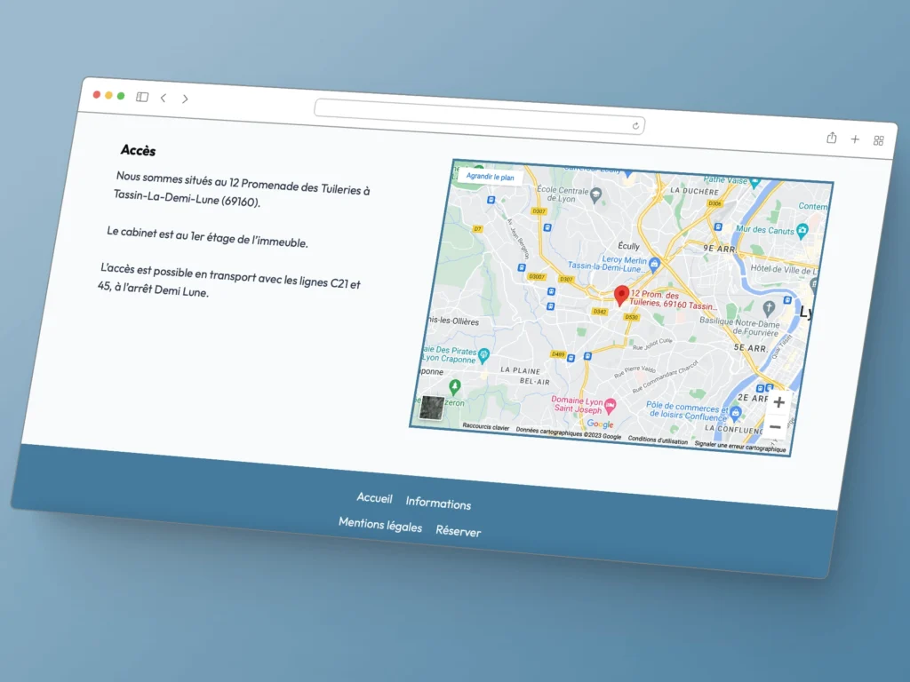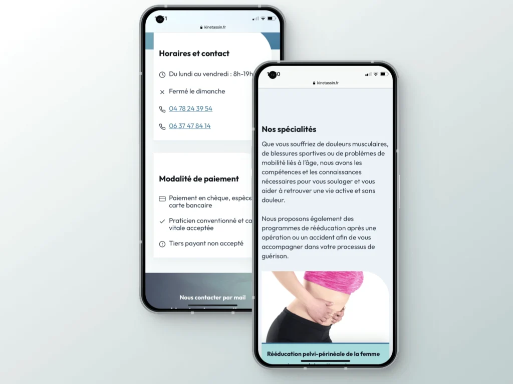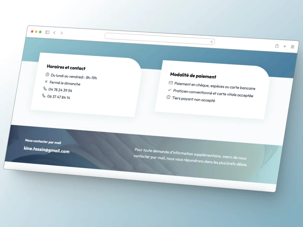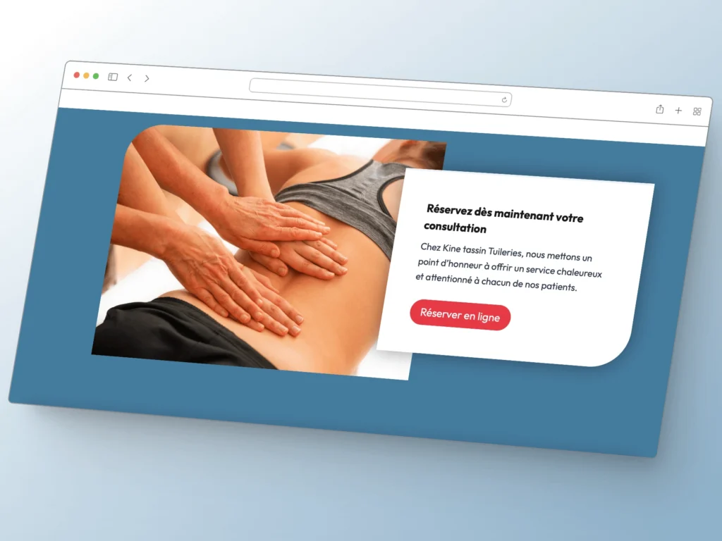 Création d’un site présentant le cabinet de kiné, les services proposés, les informations nécessaires au bon déroulement du rendez-vous et permettant la prise de rendez vous en ligne.