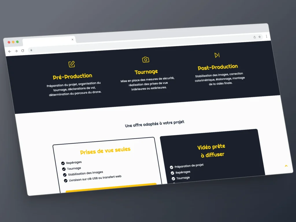 Création d’un site présentant les services d’une entreprise d’images aériennes en drone. Le site permet de présenter l’activité de l’entreprise et d’attirer de nouveaux prospects grâce à son référencement naturel.