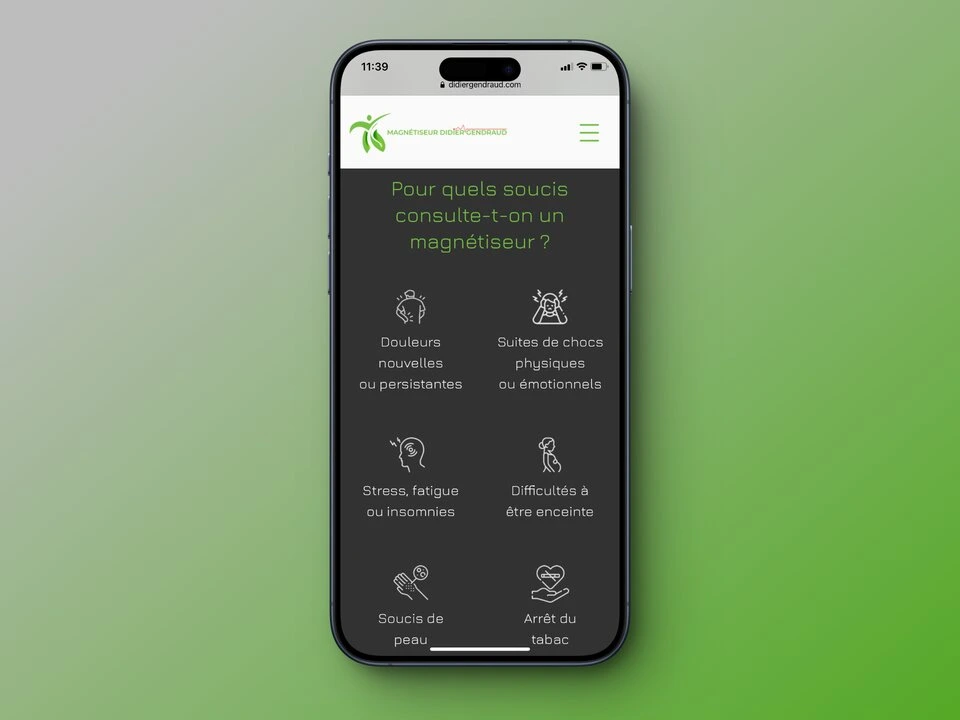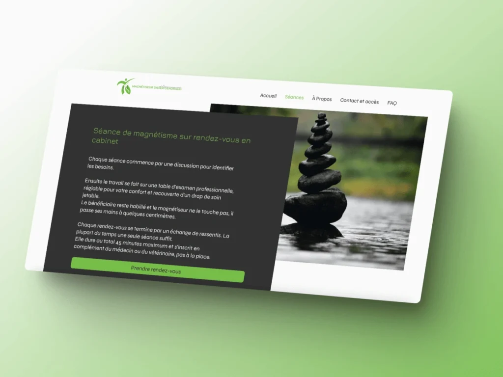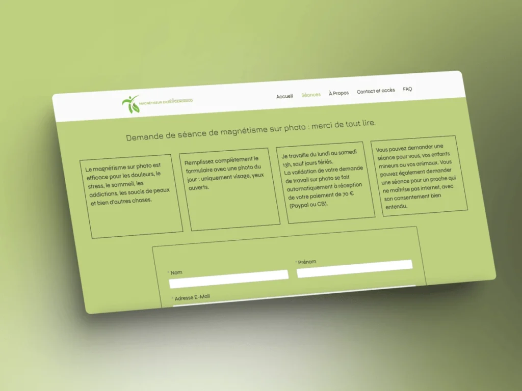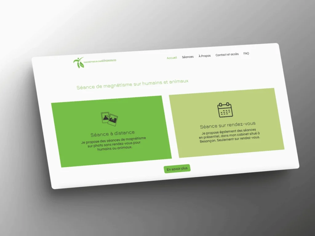 Refonte et restructuration d’un site présentant l’activité d’un magnétiseur. Le site permet de répondre aux premières questions et réserver une séance de magnétisme sur rendez-vous ou à distance en procédant directement au paiement en ligne.